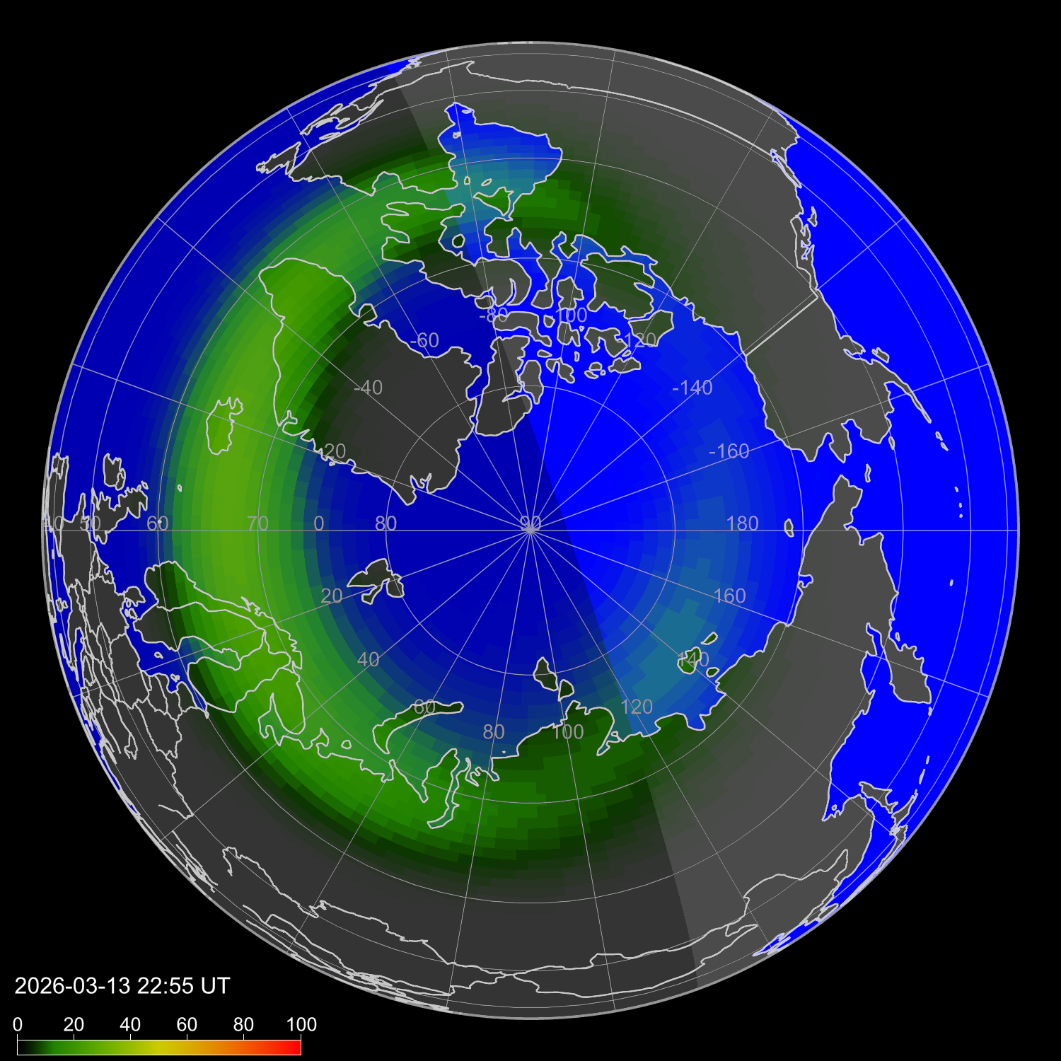 Изменения и часовой прогноз индекса интенсивности полярных сияний с 2026-03-13 по 2026-03-14