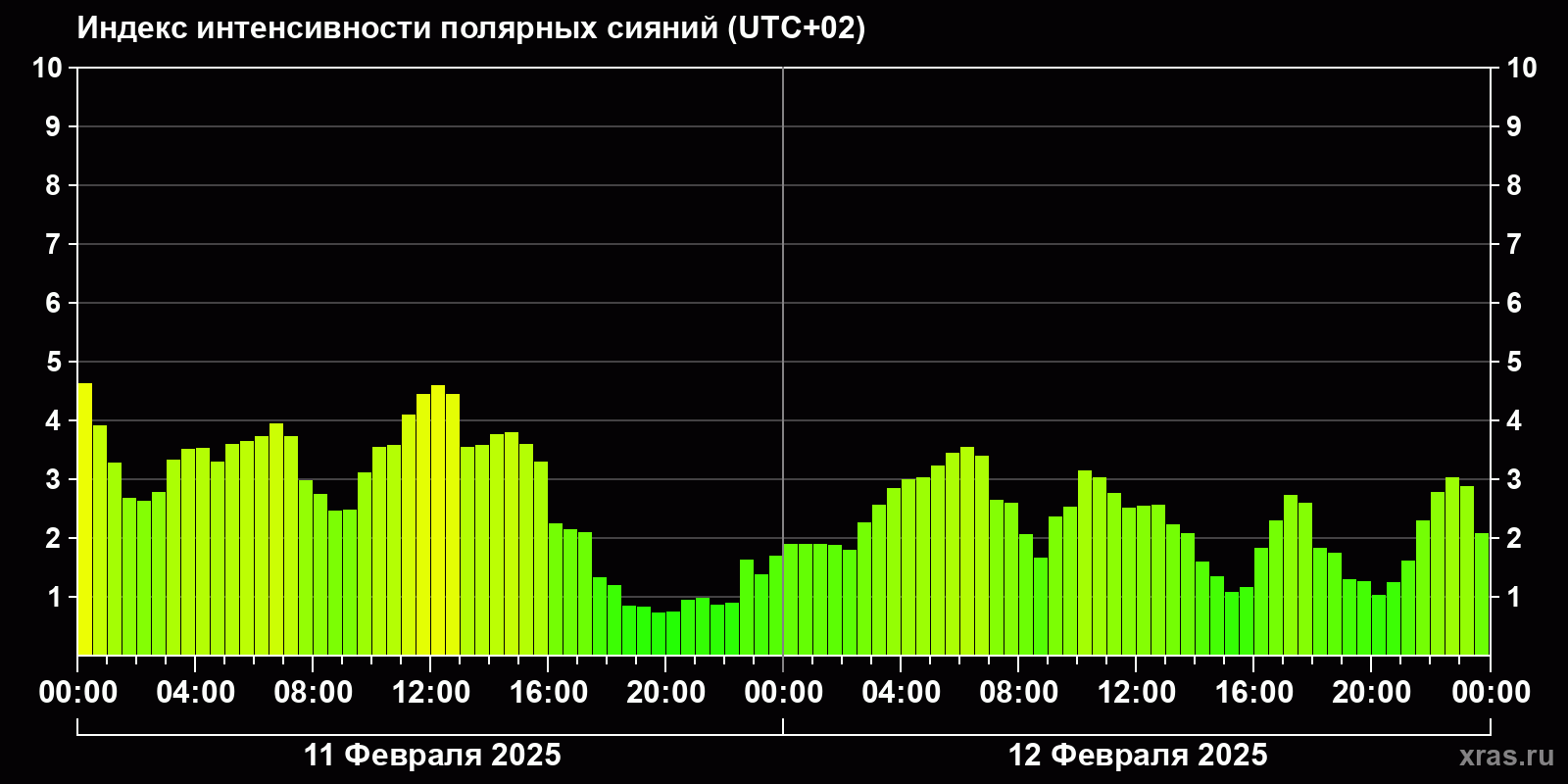 Изменения индекса интенсивности полярных сияний с 2025-02-11 по 2025-02-12 по местному времени