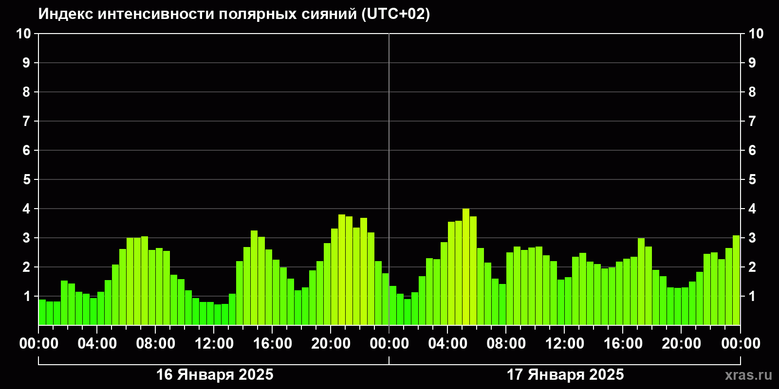 Изменения индекса интенсивности полярных сияний с 2025-01-16 по 2025-01-17 по местному времени