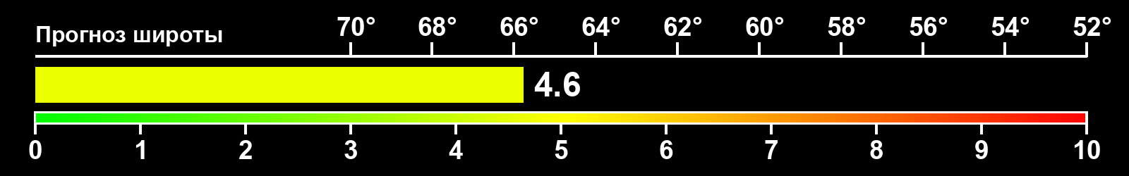 Индекс интенсивности полярных сияний и теоретически возможная широта наблюдений для ночного времени в восточном полушарии по состоянию на 2026-03-22 23:56 (конец дня) по местному времени
