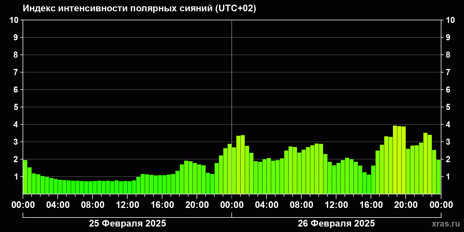 Изменения индекса интенсивности полярных сияний с 2025-02-25 по 2025-02-26 по местному времени