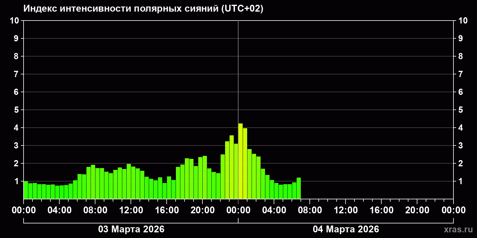 Изменения индекса интенсивности полярных сияний с 2026-03-03 по 2026-03-04 по местному времени