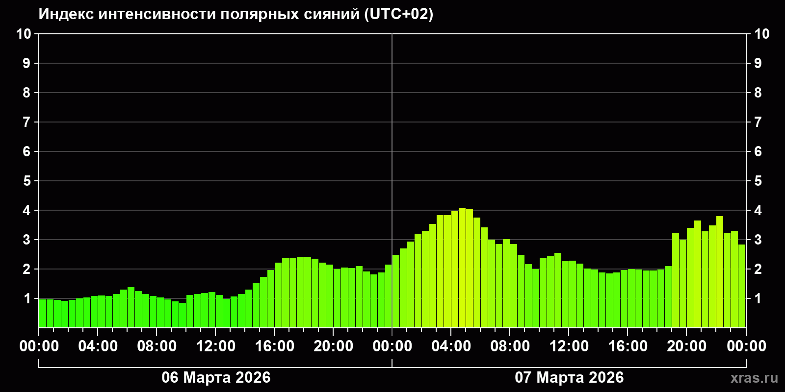 Изменения индекса интенсивности полярных сияний с 2026-03-06 по 2026-03-07 по местному времени