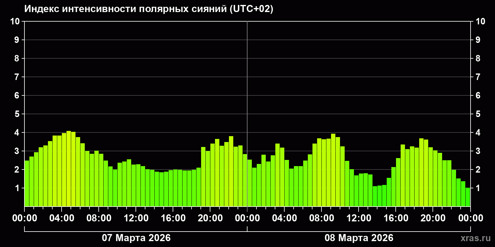 Изменения индекса интенсивности полярных сияний с 2026-03-07 по 2026-03-08 по местному времени