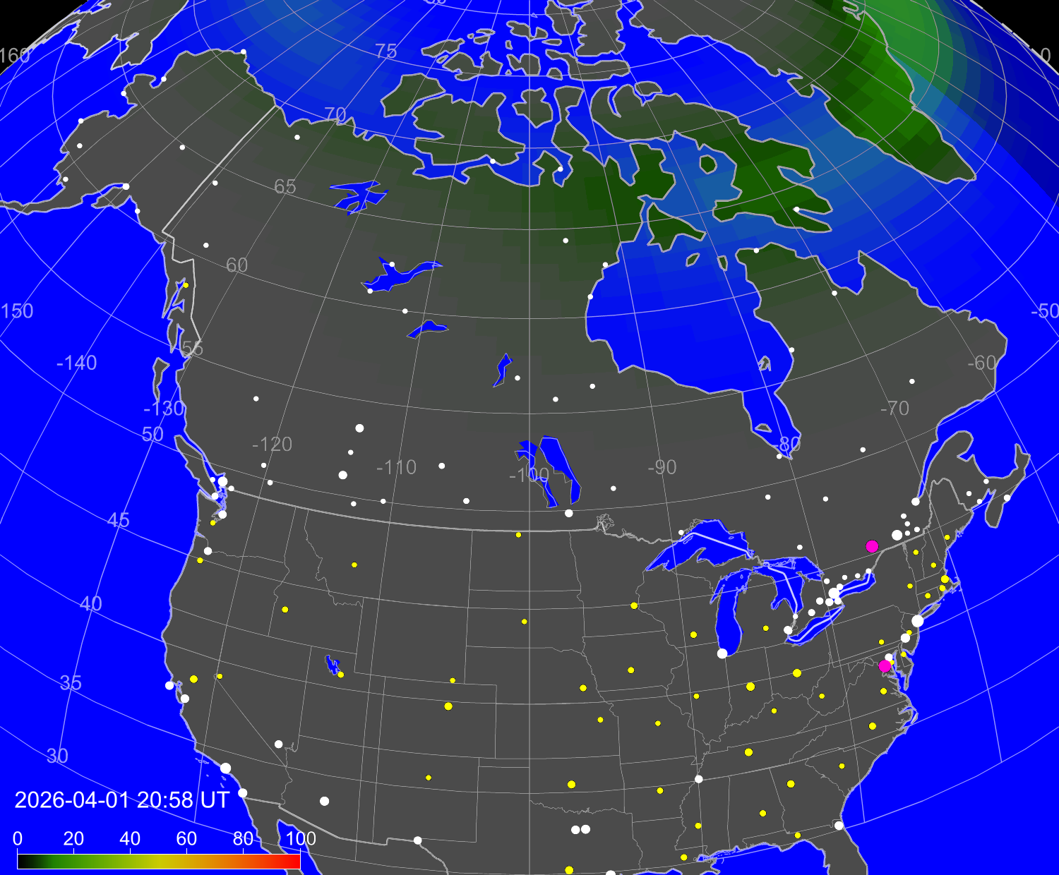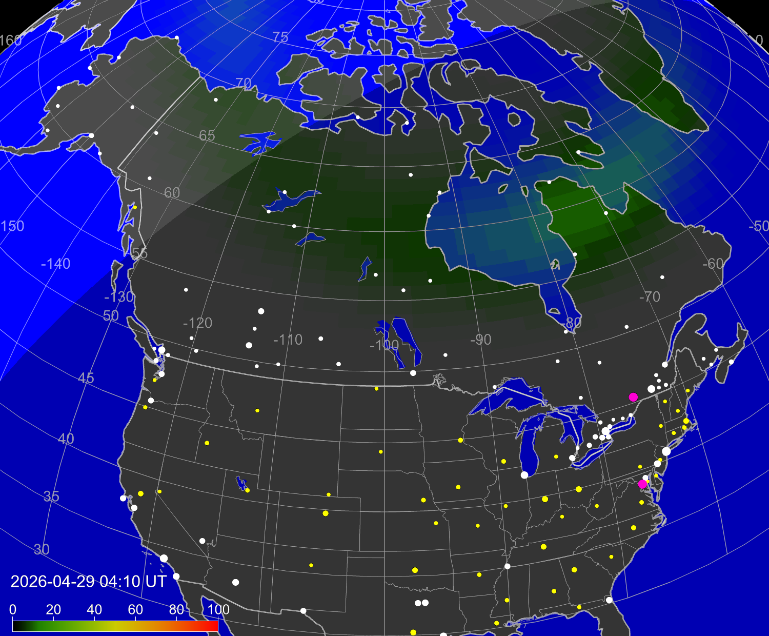 Вероятность полярных сияний в городах США