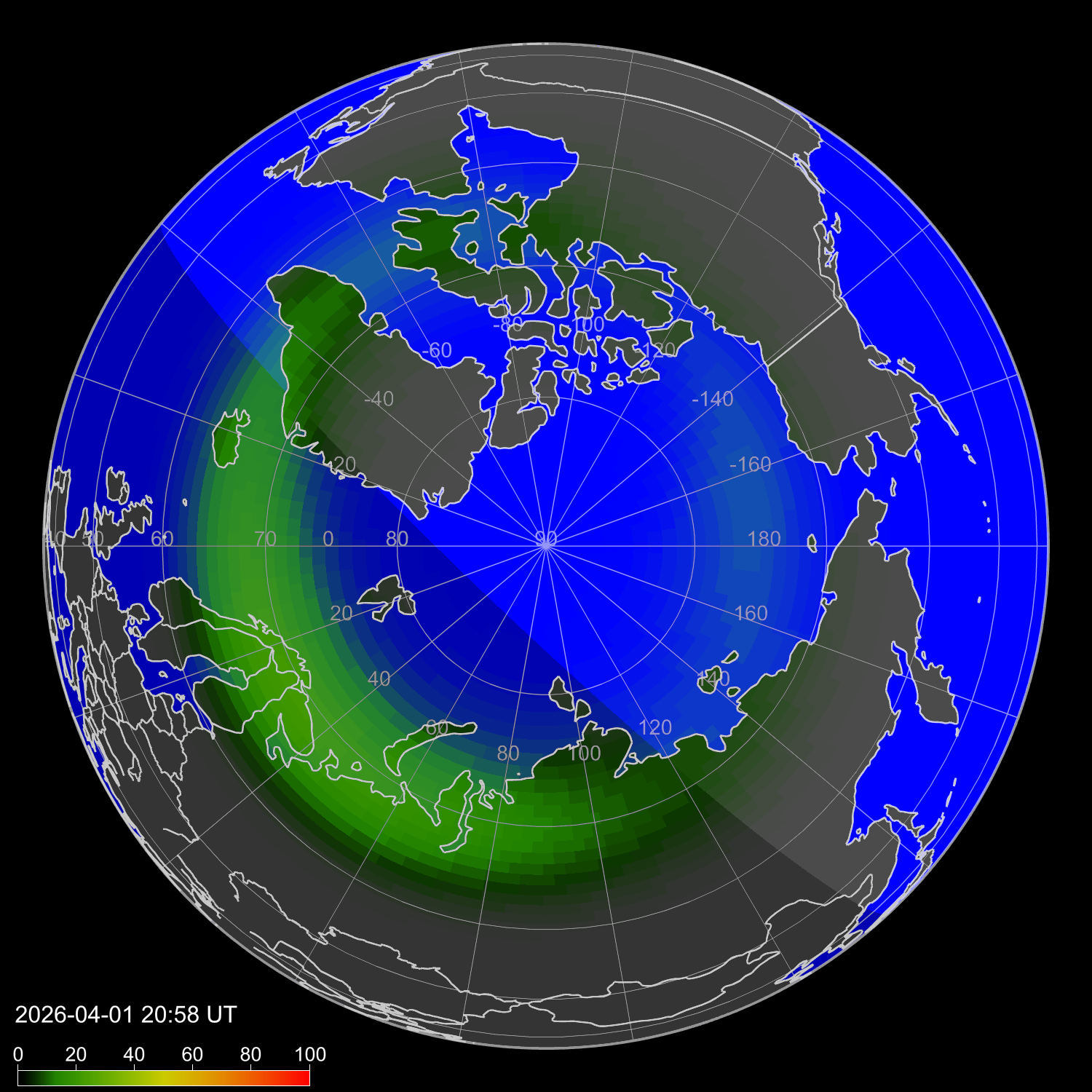 Индекс интенсивности полярных сияний и теоретически возможная широта наблюдений для ночного времени в западном полушарии