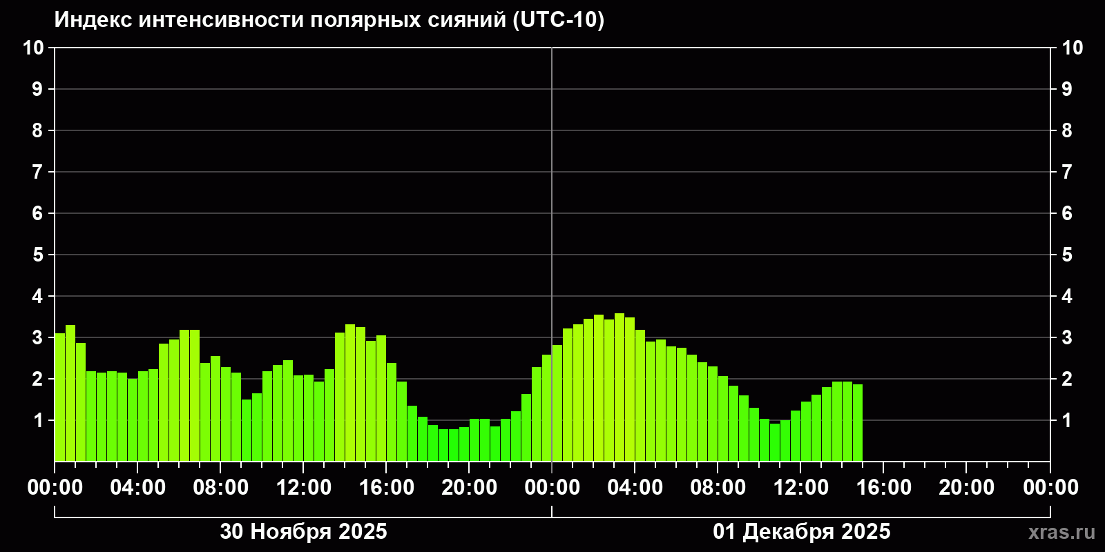 Изменения индекса интенсивности полярных сияний с 2025-11-30 по 2025-12-01 по местному времени