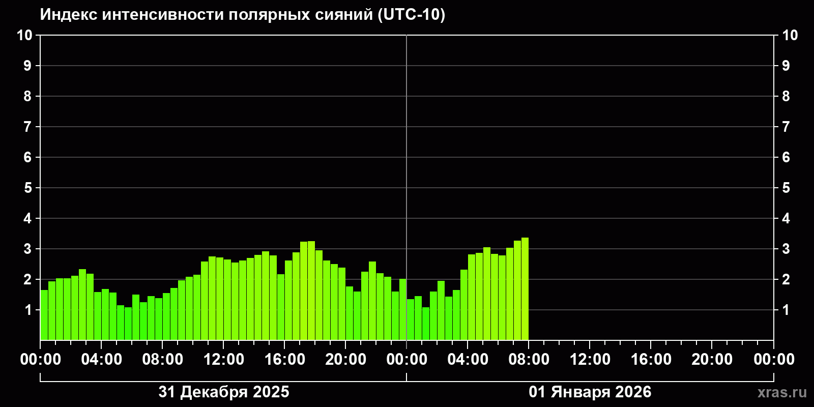 Изменения индекса интенсивности полярных сияний с 2025-12-31 по 2026-01-01 по местному времени