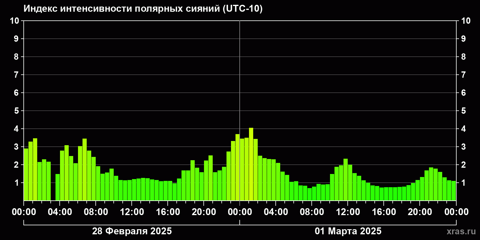 Изменения индекса интенсивности полярных сияний с 2025-02-28 по 2025-03-01 по местному времени
