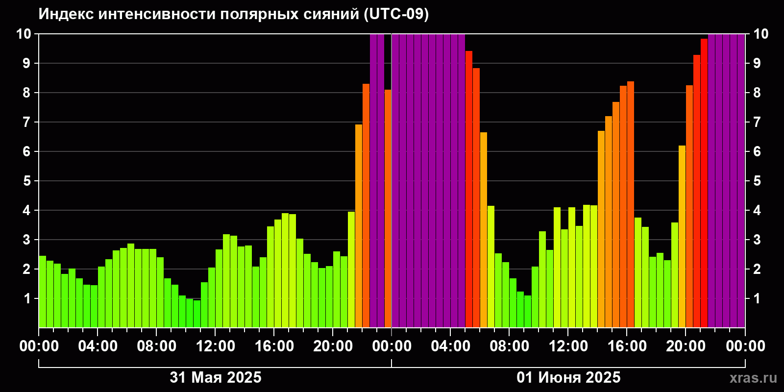 Изменения индекса интенсивности полярных сияний с 2025-05-31 по 2025-06-01 по местному времени