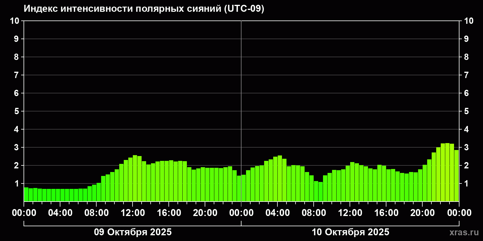 Изменения индекса интенсивности полярных сияний с 2025-10-09 по 2025-10-10 по местному времени