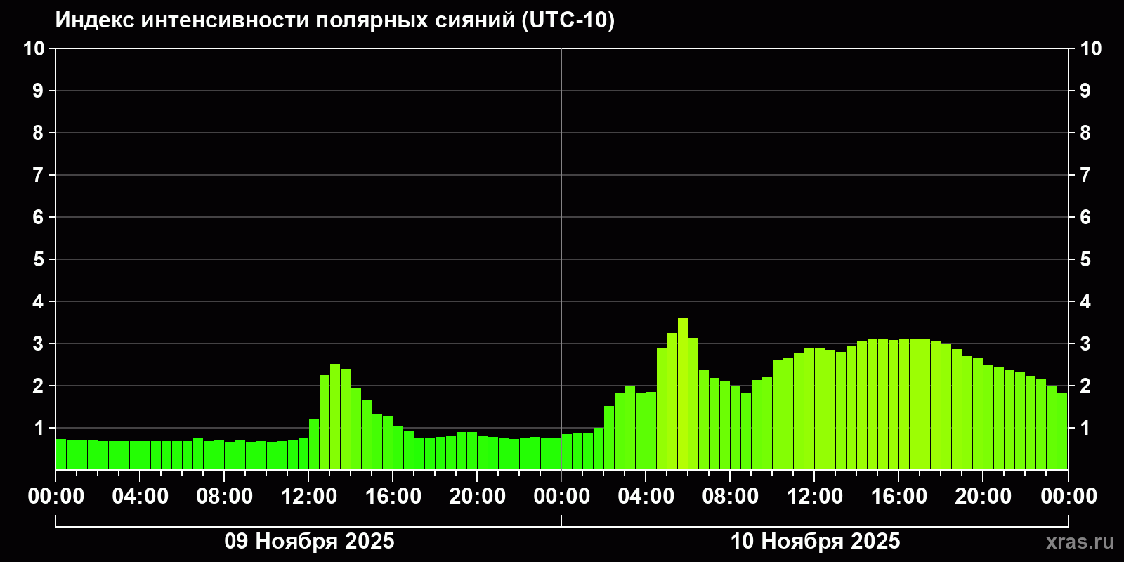 Изменения индекса интенсивности полярных сияний с 2025-11-09 по 2025-11-10 по местному времени