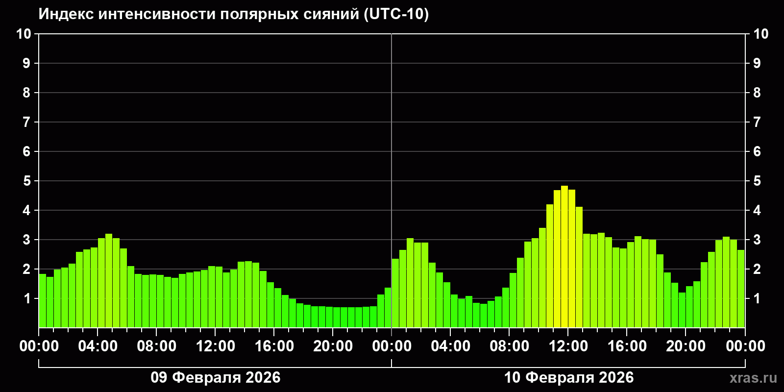 Изменения индекса интенсивности полярных сияний с 2026-02-09 по 2026-02-10 по местному времени