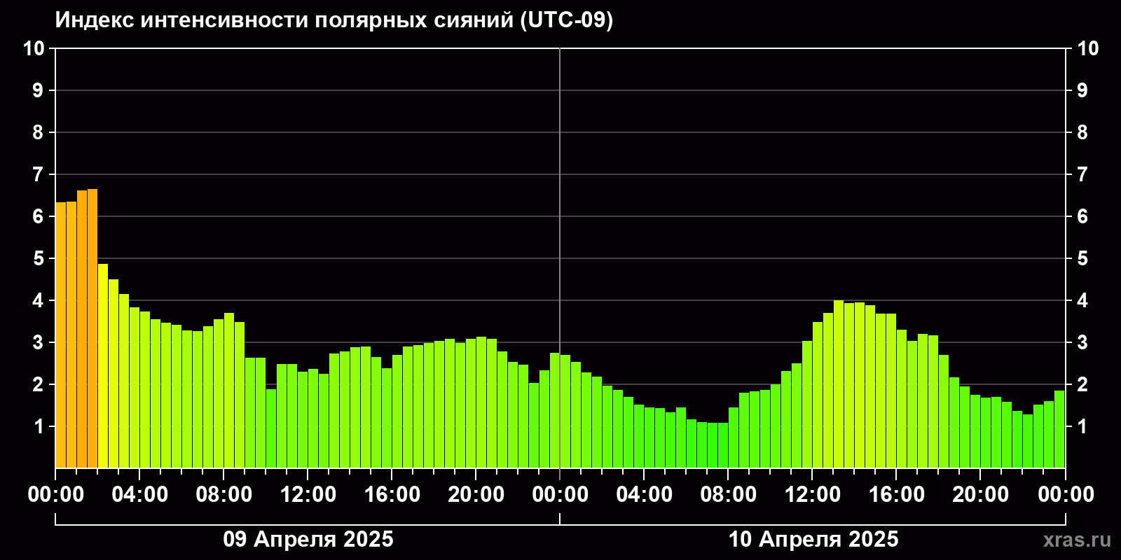 Изменения индекса интенсивности полярных сияний с 2025-04-09 по 2025-04-10 по местному времени