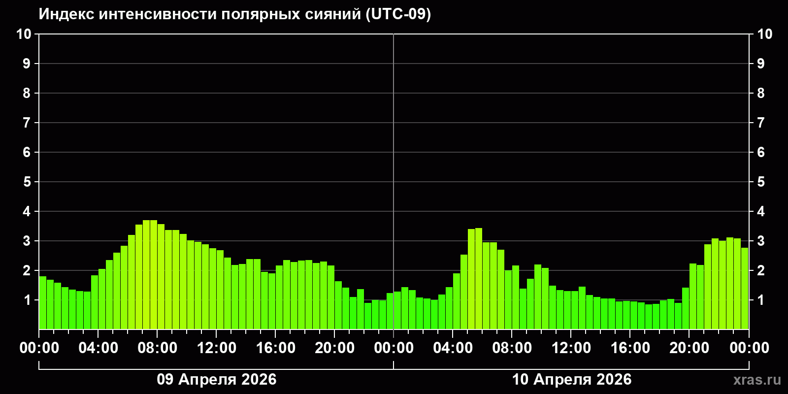 Изменения индекса интенсивности полярных сияний с 2026-04-09 по 2026-04-10 по местному времени