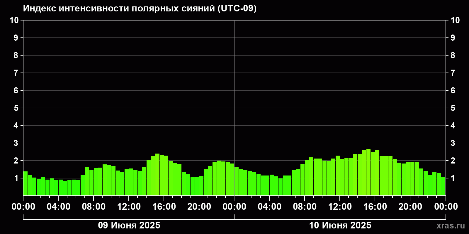 Изменения индекса интенсивности полярных сияний с 2025-06-09 по 2025-06-10 по местному времени
