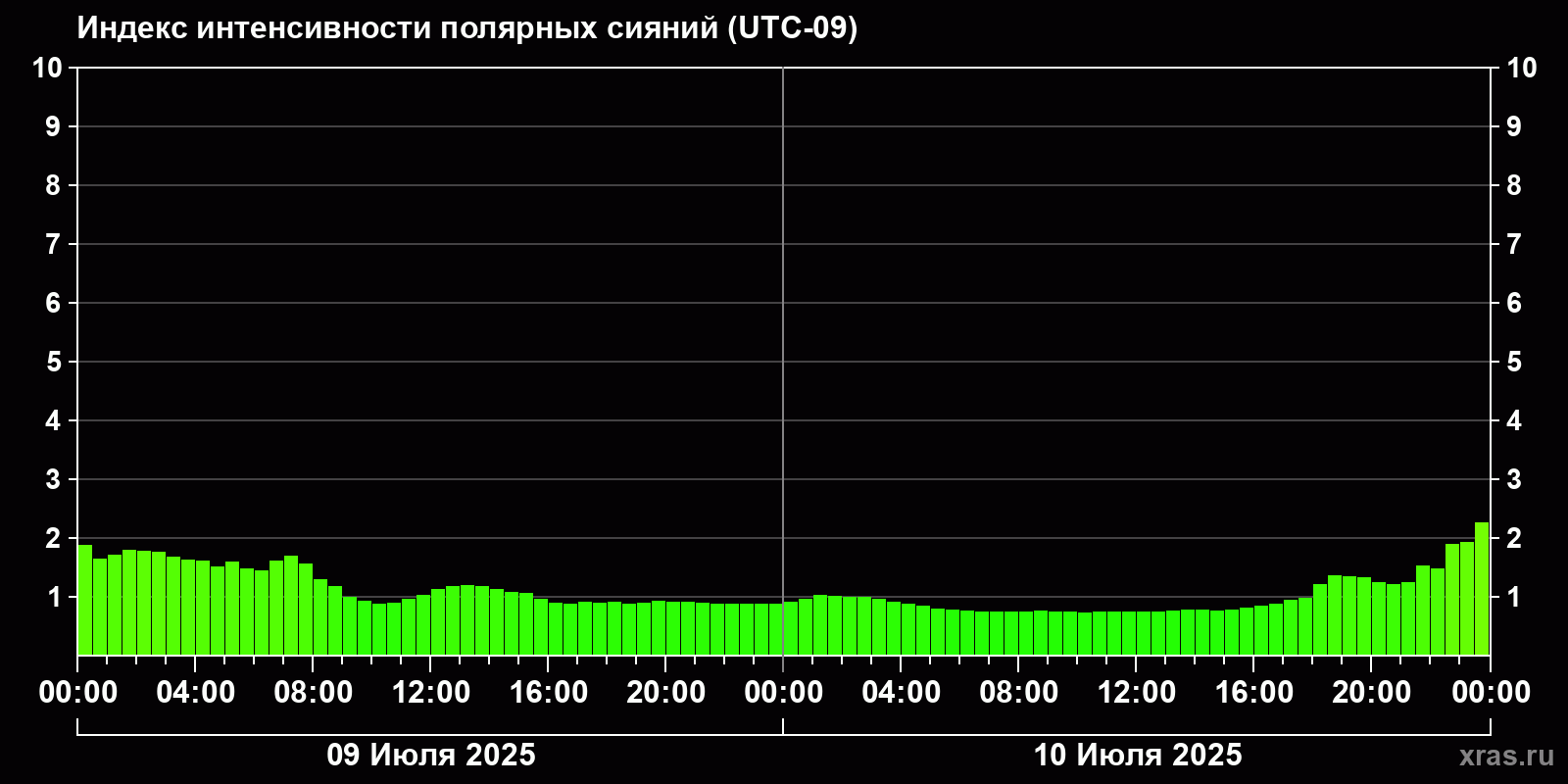 Изменения индекса интенсивности полярных сияний с 2025-07-09 по 2025-07-10 по местному времени