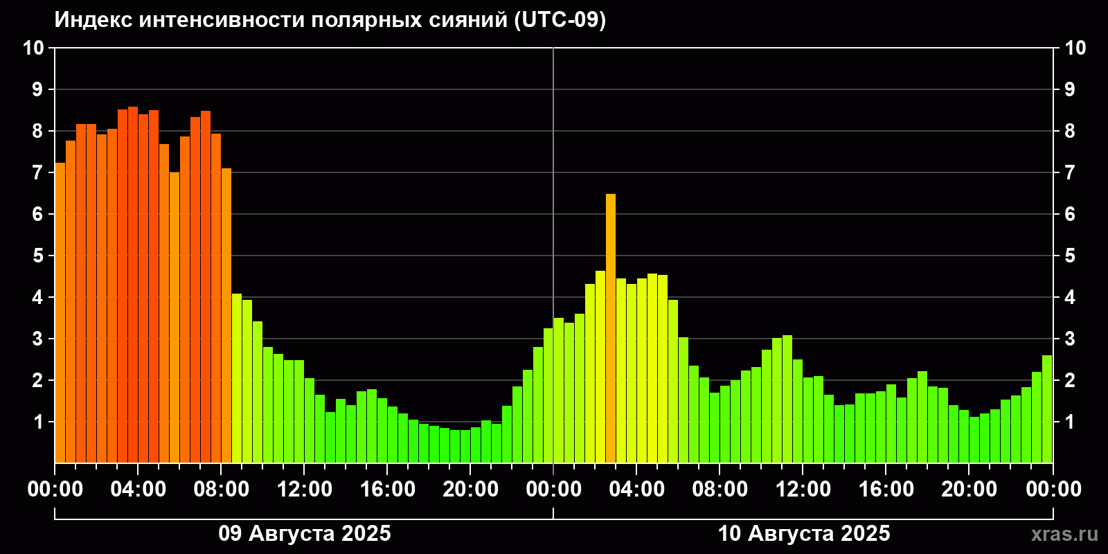 Изменения индекса интенсивности полярных сияний с 2025-08-09 по 2025-08-10 по местному времени