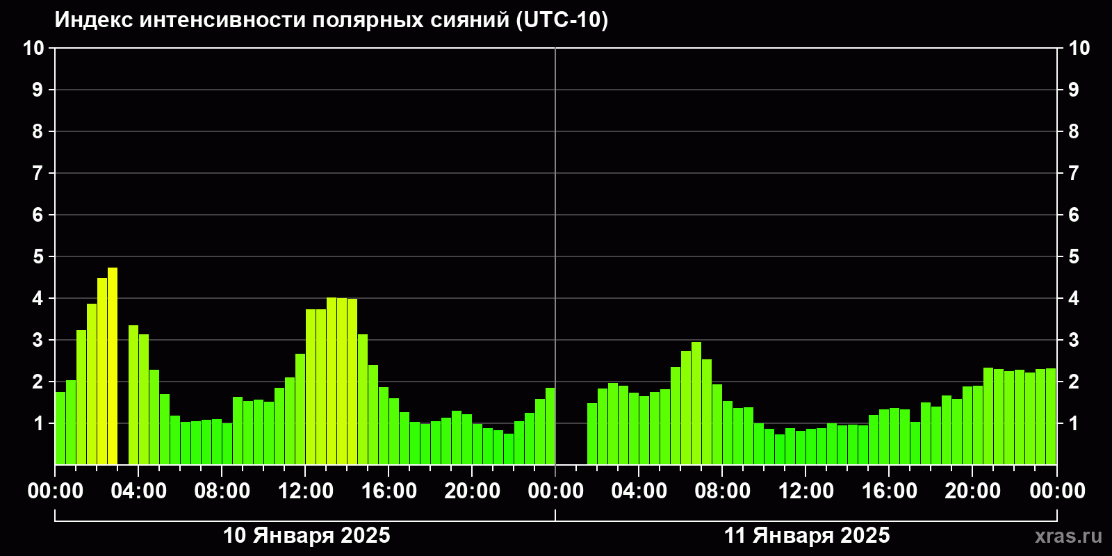 Изменения индекса интенсивности полярных сияний с 2025-01-10 по 2025-01-11 по местному времени
