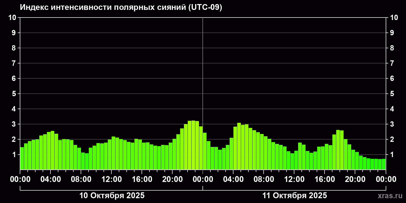 Изменения индекса интенсивности полярных сияний с 2025-10-10 по 2025-10-11 по местному времени