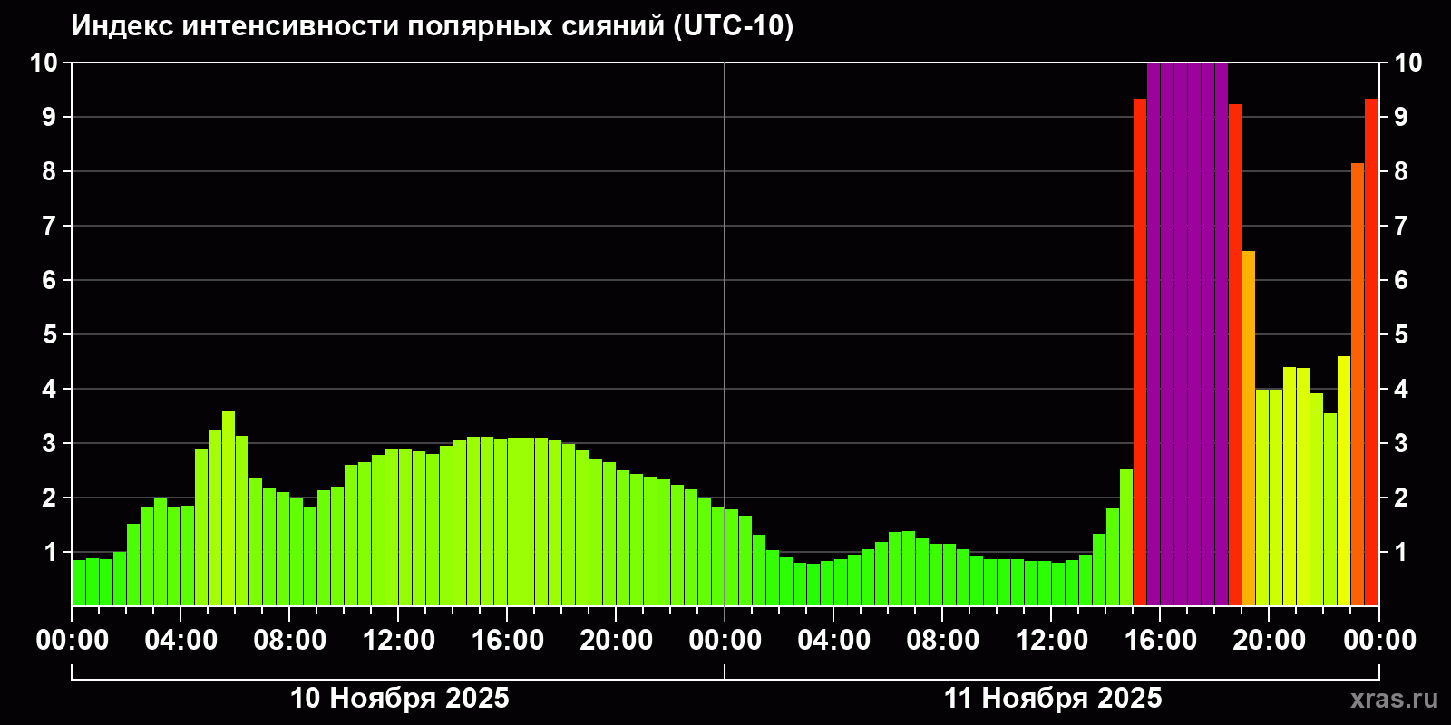 Изменения индекса интенсивности полярных сияний с 2025-11-10 по 2025-11-11 по местному времени