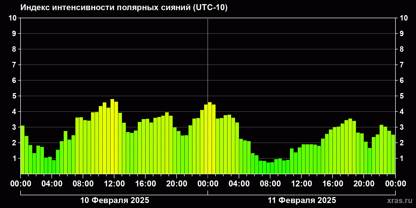 Изменения индекса интенсивности полярных сияний с 2025-02-10 по 2025-02-11 по местному времени
