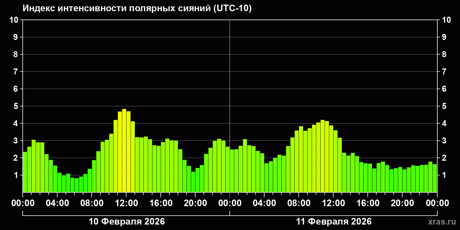Изменения индекса интенсивности полярных сияний с 2026-02-10 по 2026-02-11 по местному времени