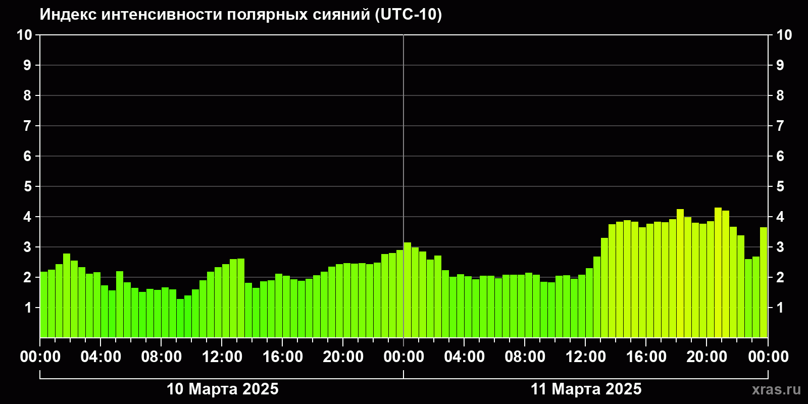 Изменения индекса интенсивности полярных сияний с 2025-03-10 по 2025-03-11 по местному времени