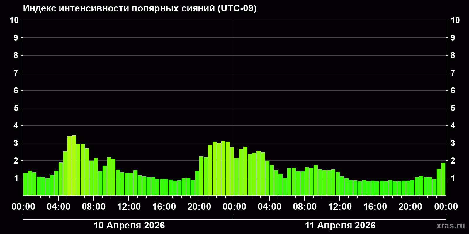Изменения индекса интенсивности полярных сияний с 2026-04-10 по 2026-04-11 по местному времени