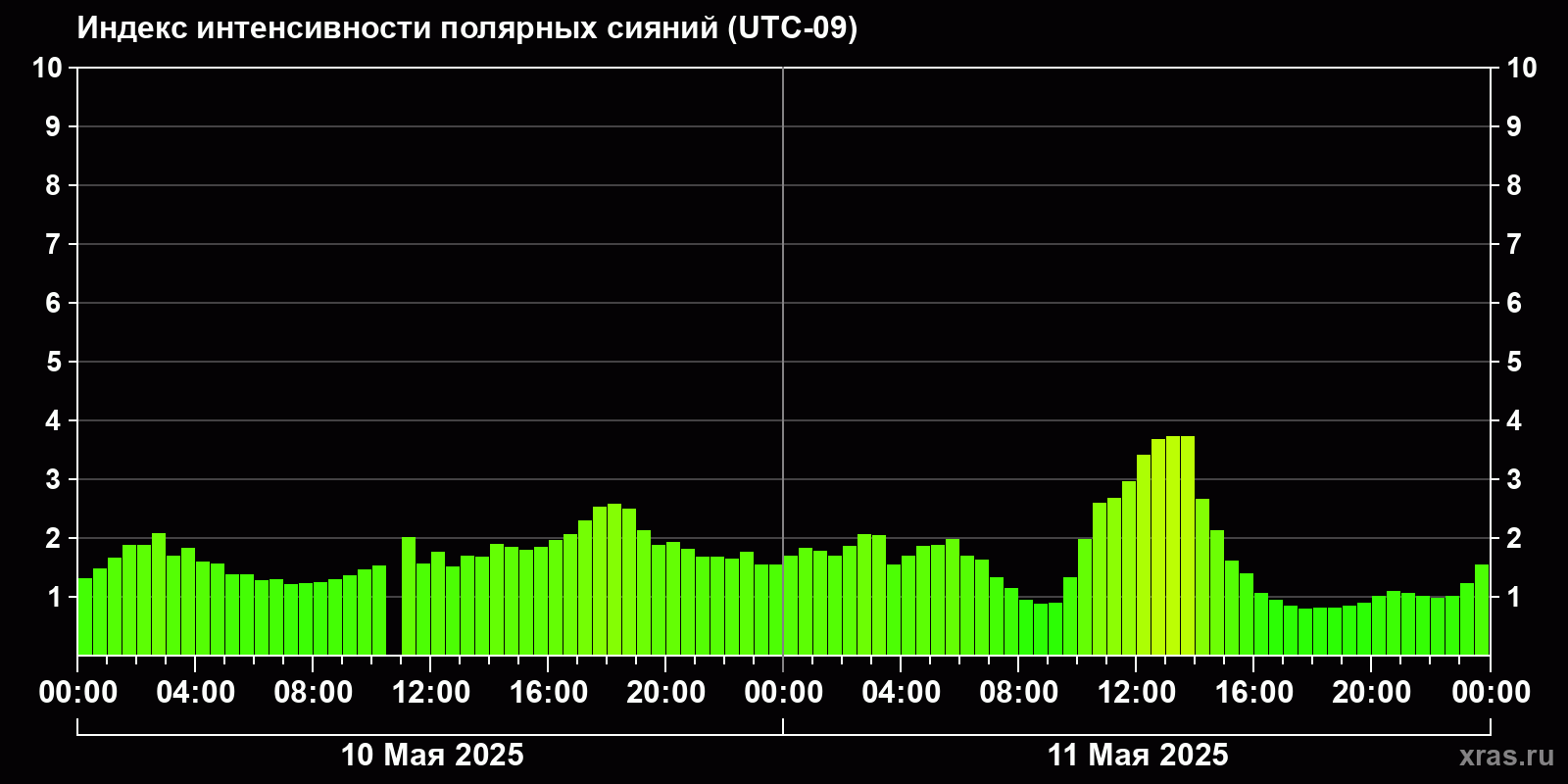 Изменения индекса интенсивности полярных сияний с 2025-05-10 по 2025-05-11 по местному времени