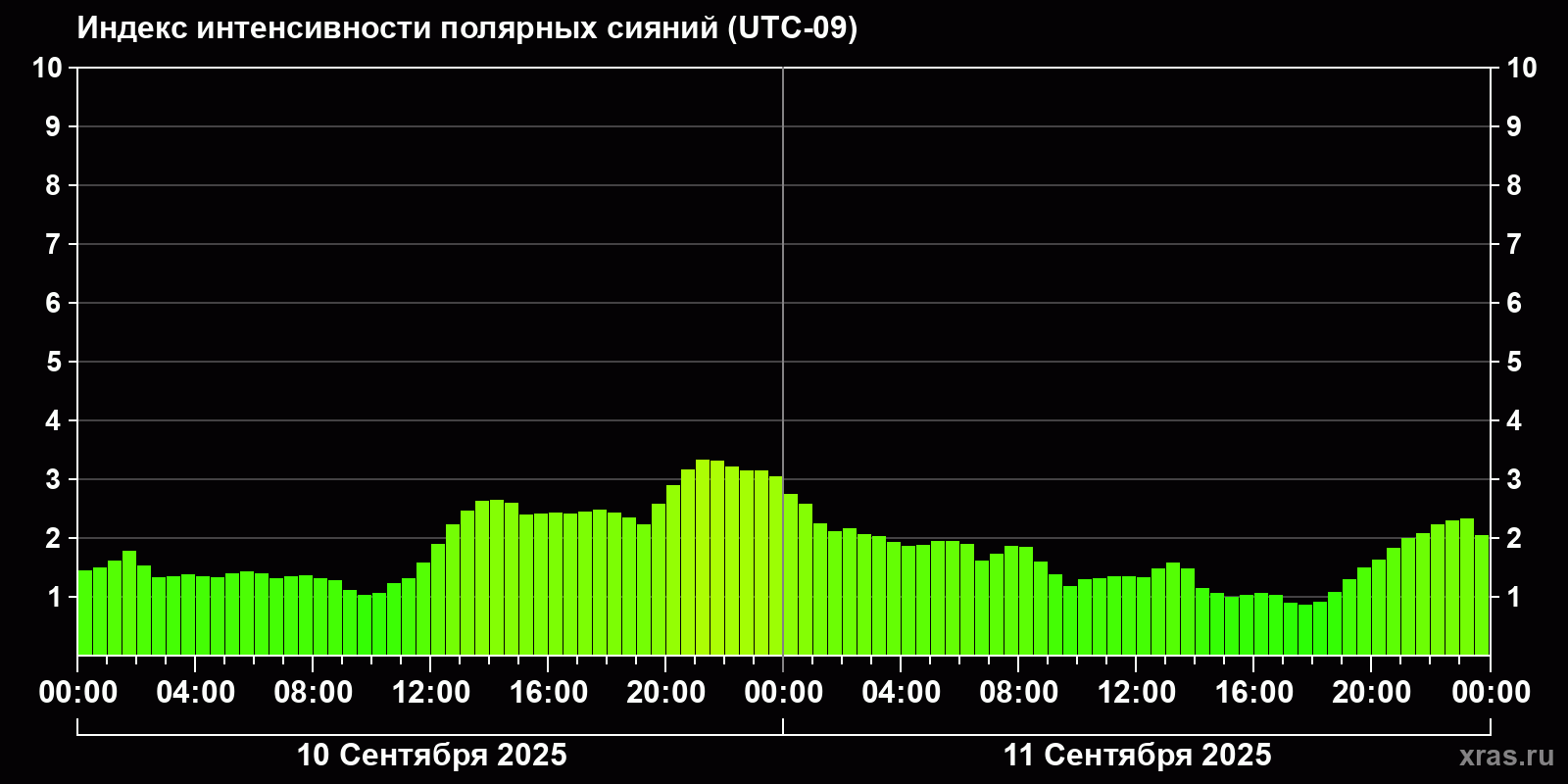 Изменения индекса интенсивности полярных сияний с 2025-09-10 по 2025-09-11 по местному времени