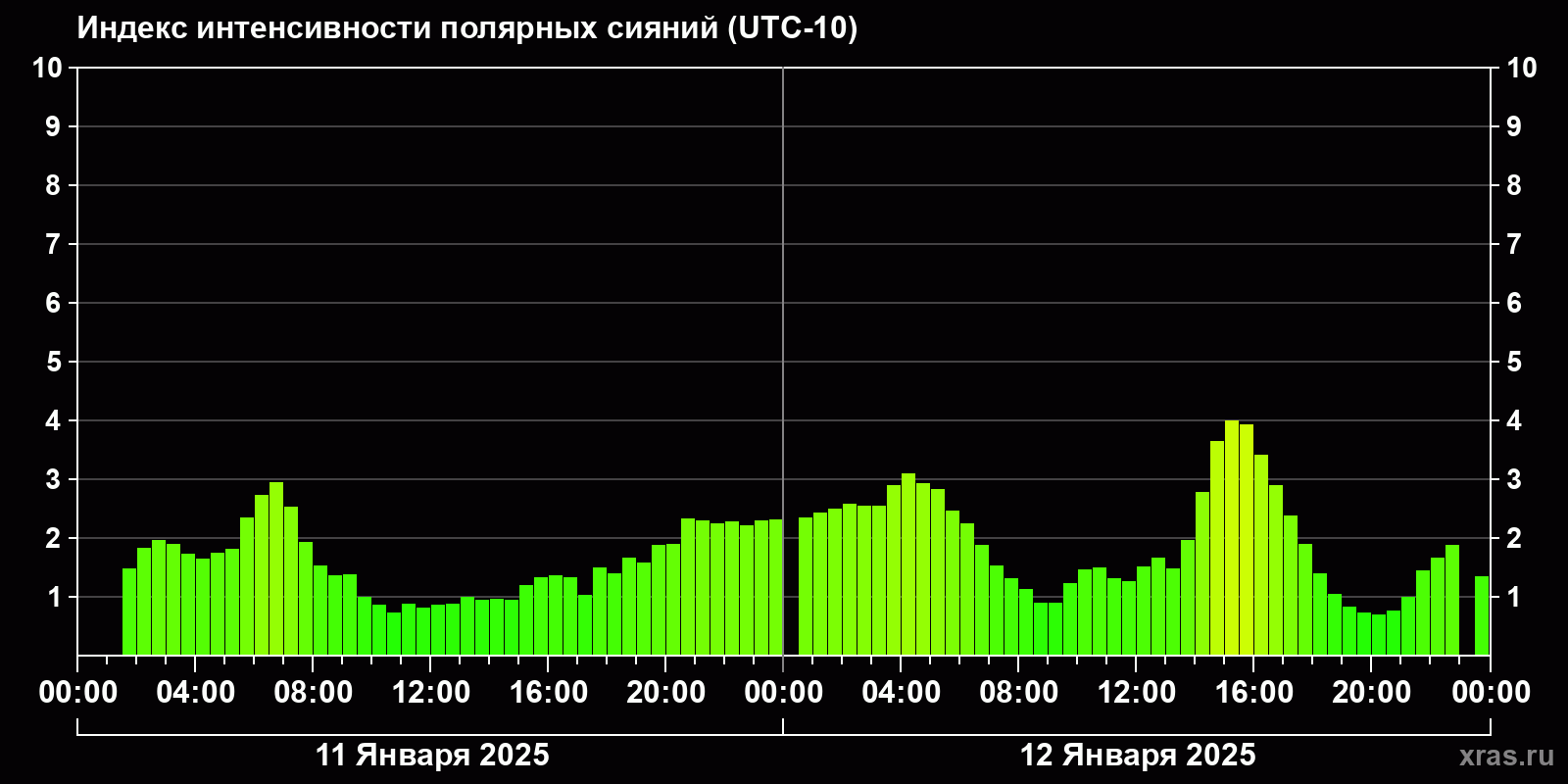 Изменения индекса интенсивности полярных сияний с 2025-01-11 по 2025-01-12 по местному времени