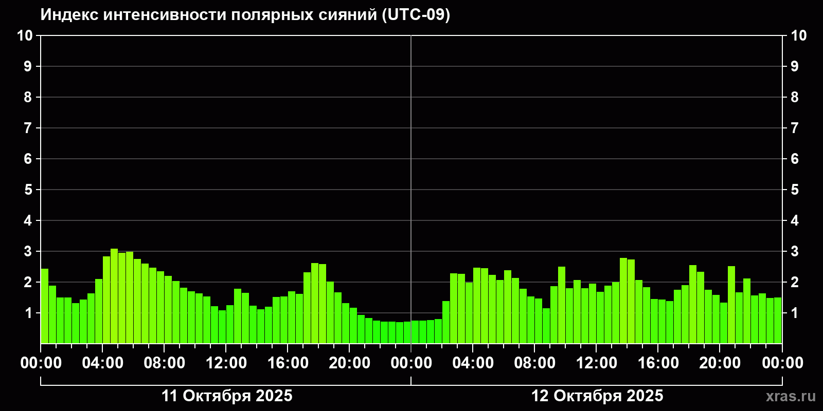 Изменения индекса интенсивности полярных сияний с 2025-10-11 по 2025-10-12 по местному времени