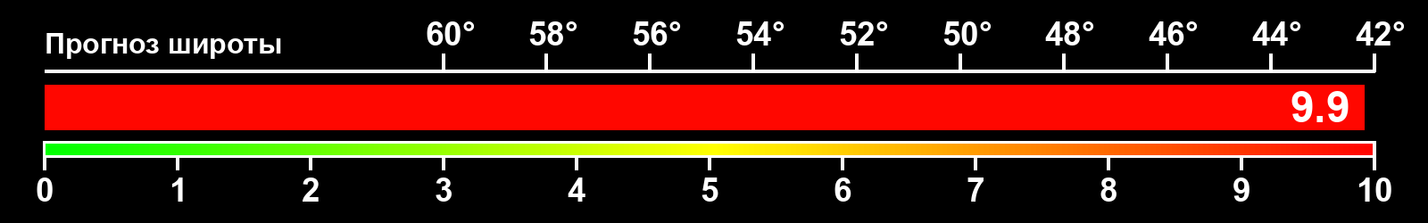 Индекс интенсивности полярных сияний и теоретически возможная широта наблюдений для ночного времени в западном полушарии по состоянию на 2025-11-12 23:58 (конец дня) по местному времени