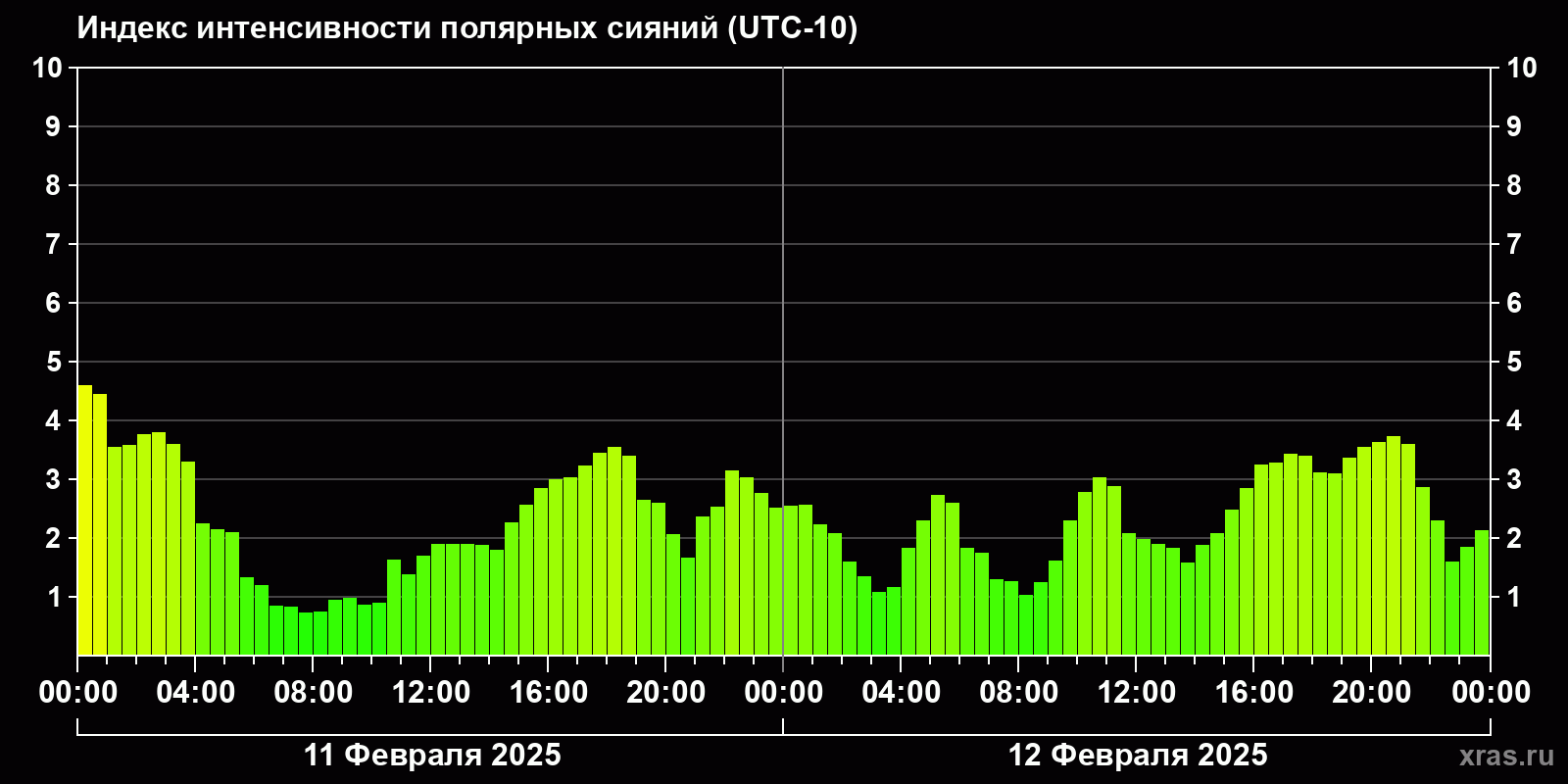 Изменения индекса интенсивности полярных сияний с 2025-02-11 по 2025-02-12 по местному времени