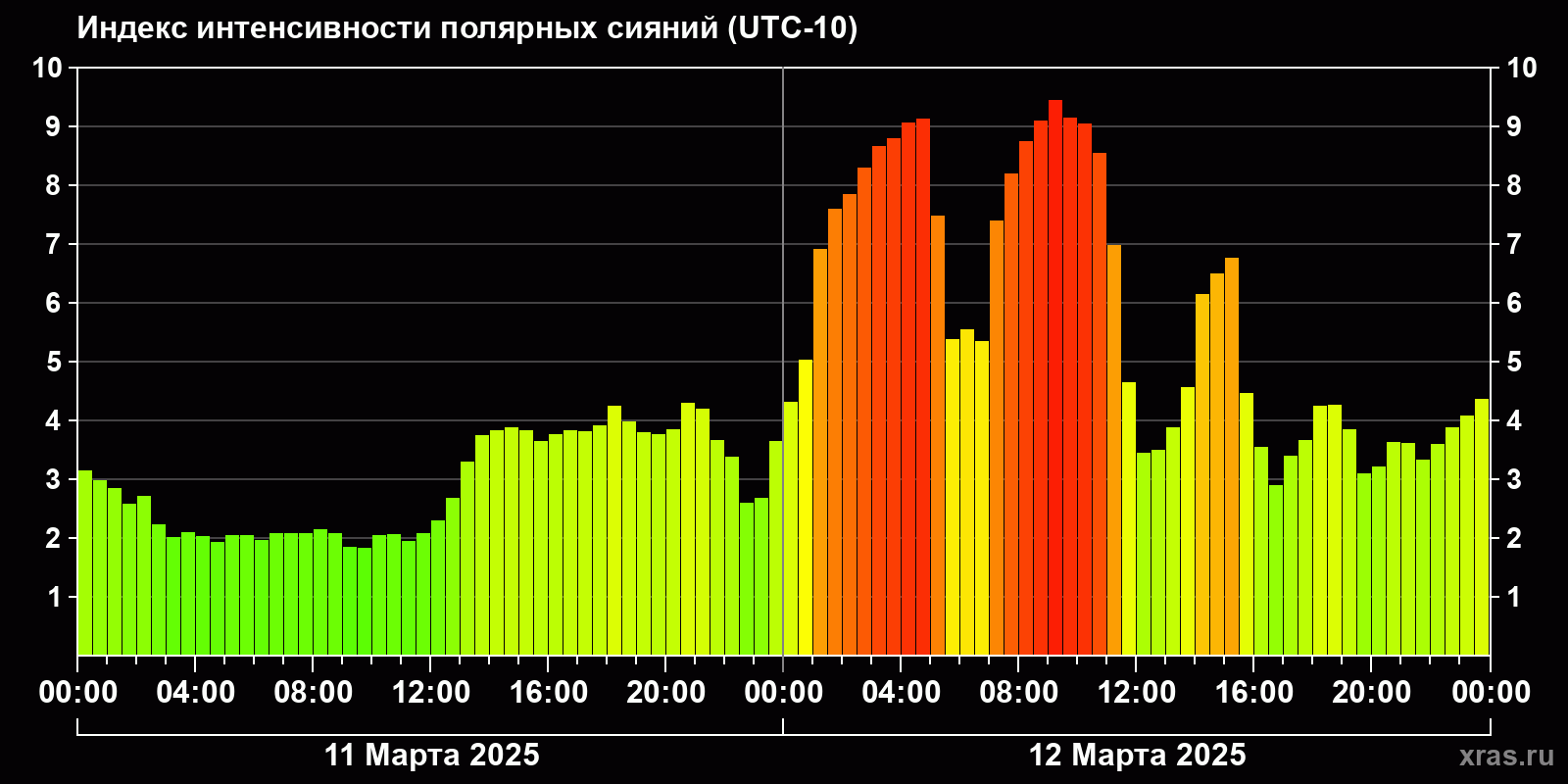 Изменения индекса интенсивности полярных сияний с 2025-03-11 по 2025-03-12 по местному времени