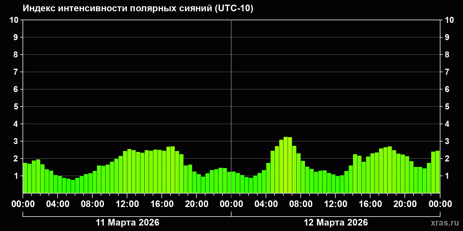 Изменения индекса интенсивности полярных сияний с 2026-03-11 по 2026-03-12 по местному времени