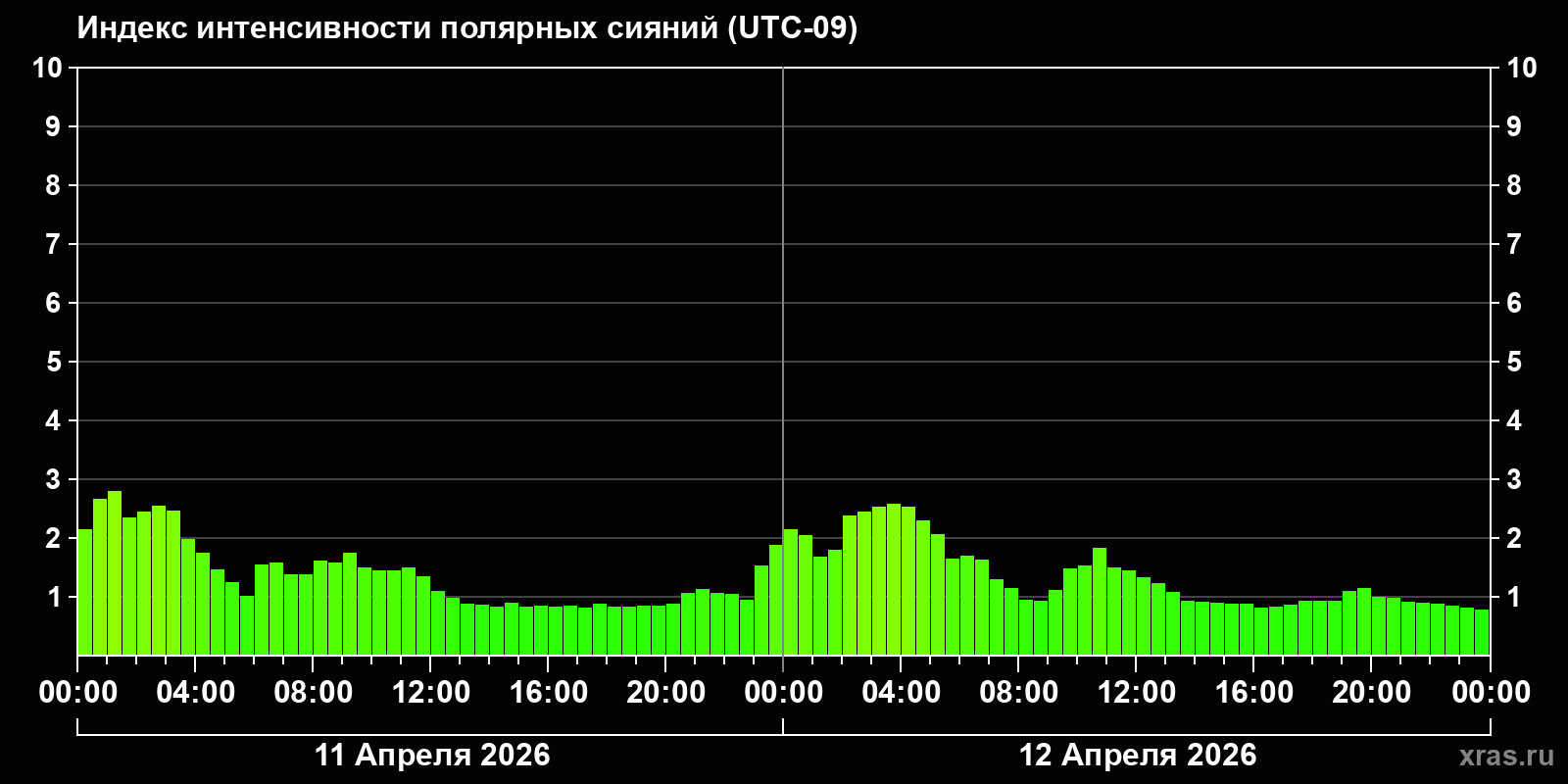 Изменения индекса интенсивности полярных сияний с 2026-04-11 по 2026-04-12 по местному времени