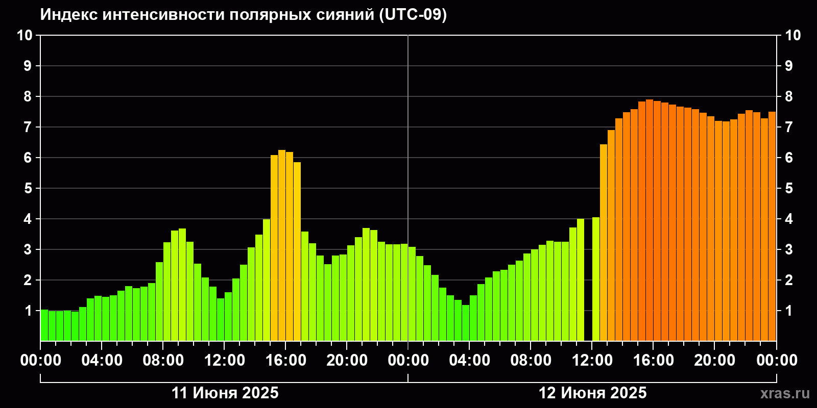 Изменения индекса интенсивности полярных сияний с 2025-06-11 по 2025-06-12 по местному времени