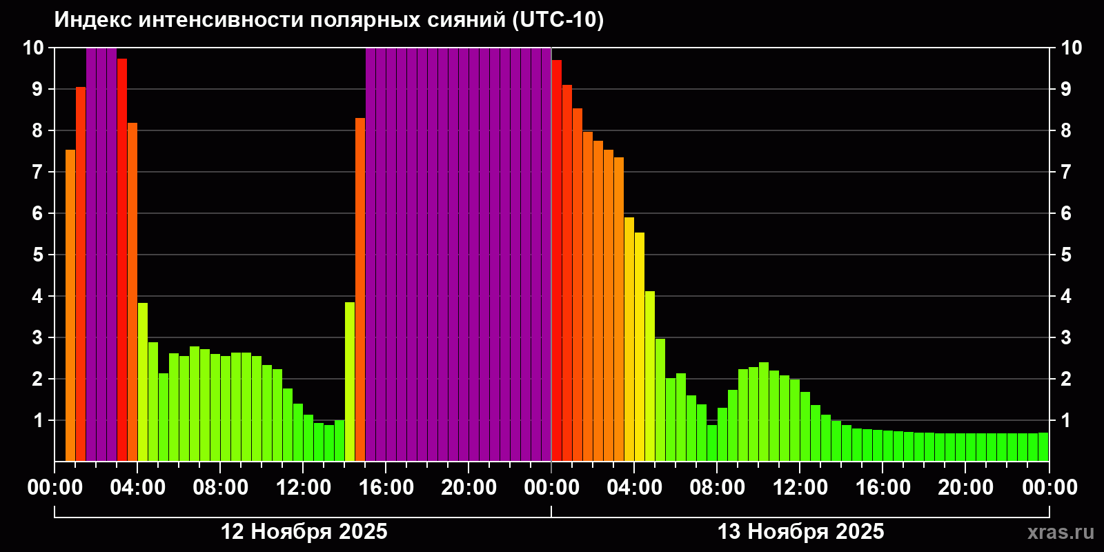 Изменения индекса интенсивности полярных сияний с 2025-11-12 по 2025-11-13 по местному времени
