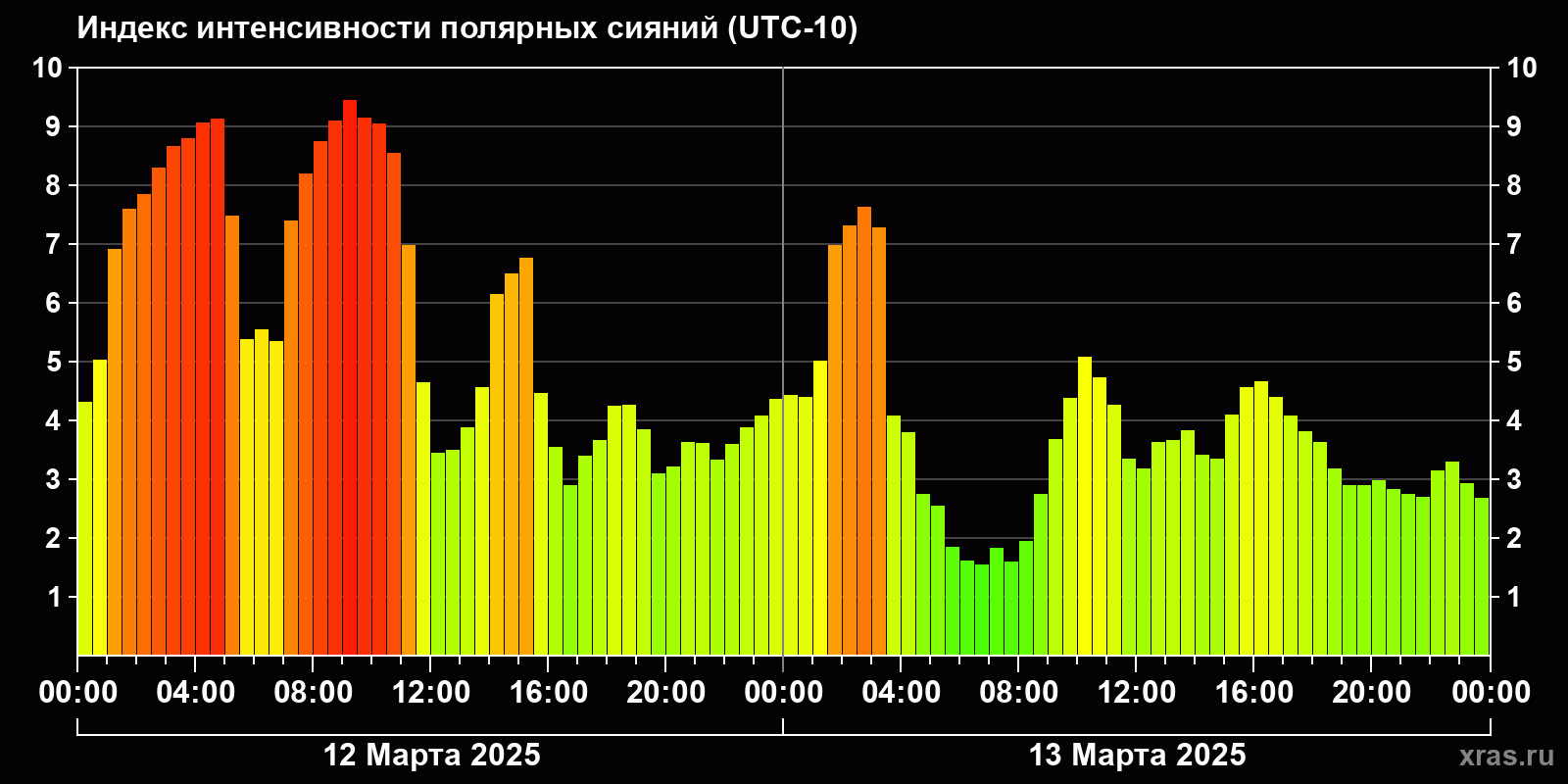 Изменения индекса интенсивности полярных сияний с 2025-03-12 по 2025-03-13 по местному времени