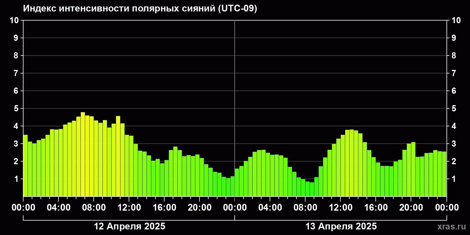 Изменения индекса интенсивности полярных сияний с 2025-04-12 по 2025-04-13 по местному времени