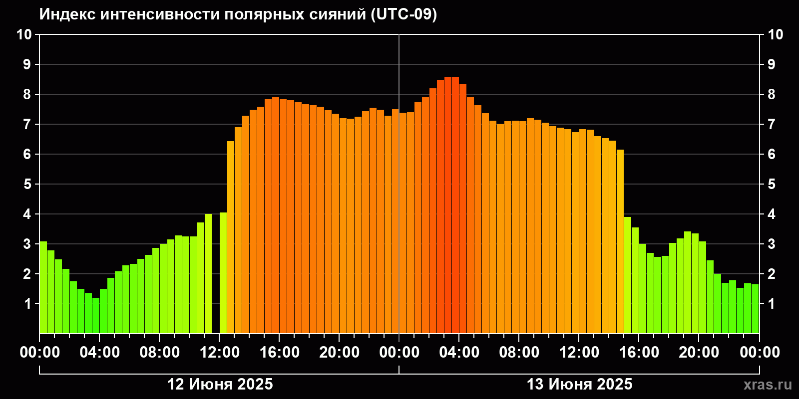 Изменения индекса интенсивности полярных сияний с 2025-06-12 по 2025-06-13 по местному времени