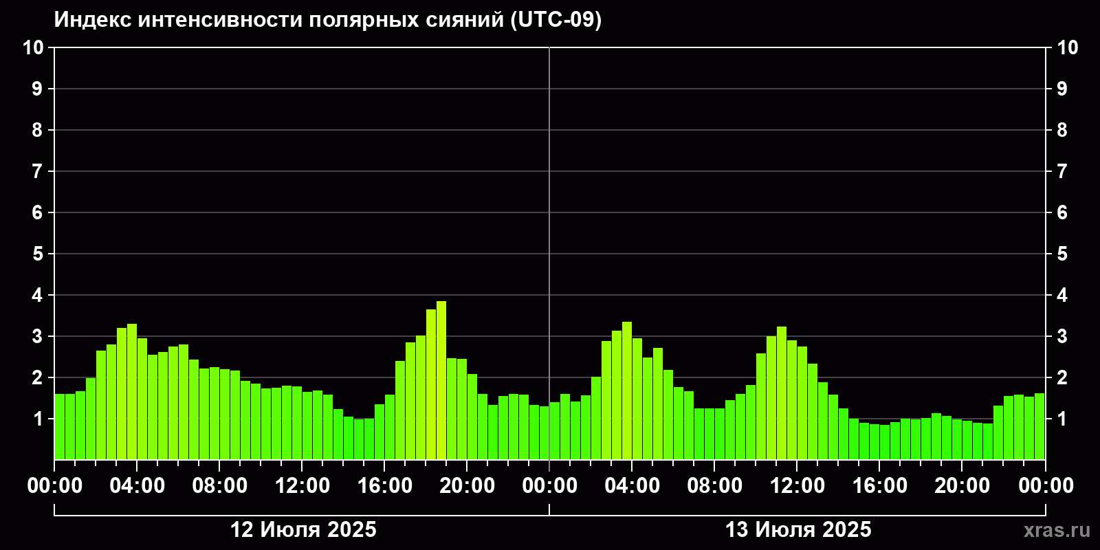 Изменения индекса интенсивности полярных сияний с 2025-07-12 по 2025-07-13 по местному времени