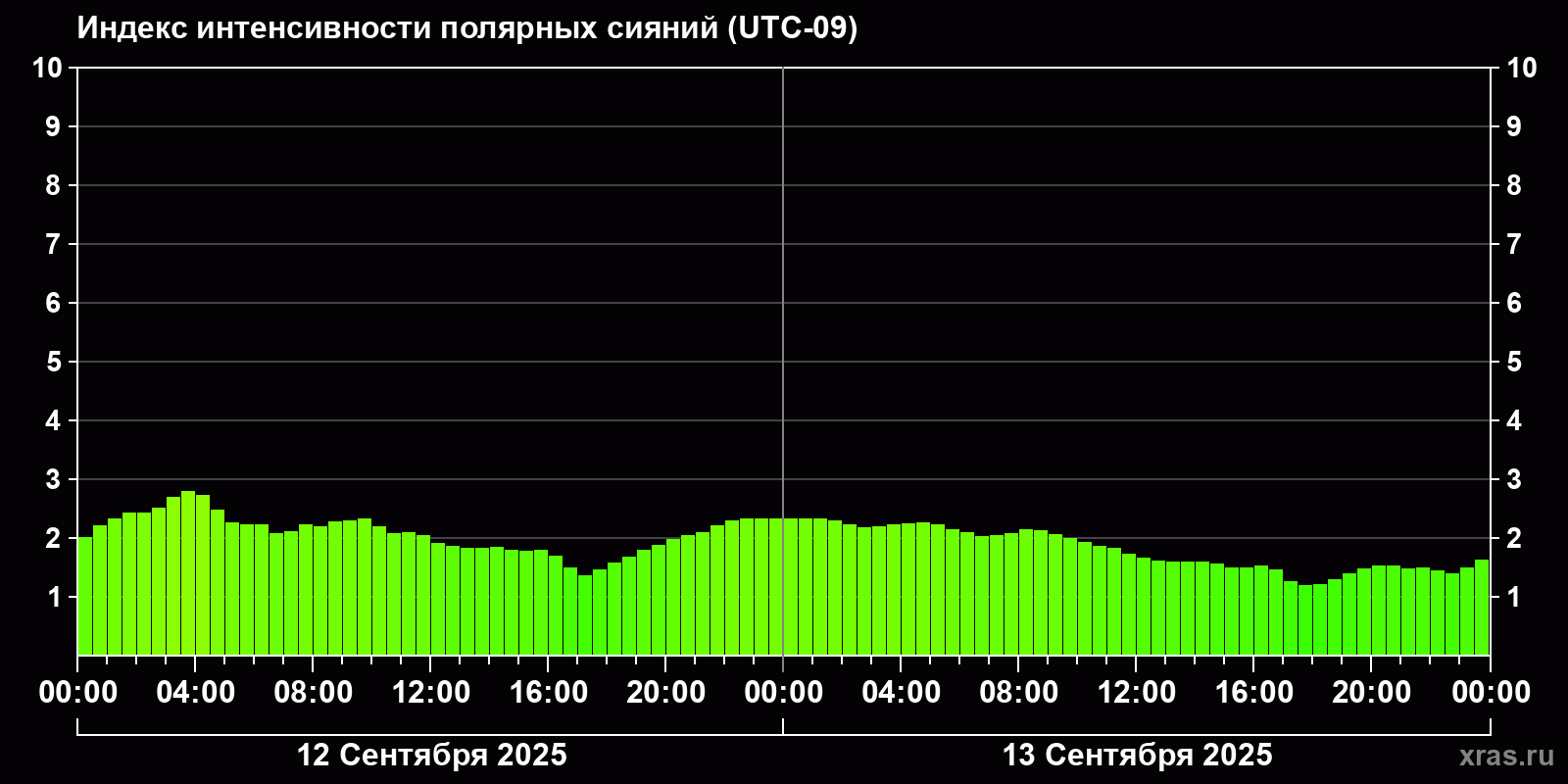 Изменения индекса интенсивности полярных сияний с 2025-09-12 по 2025-09-13 по местному времени