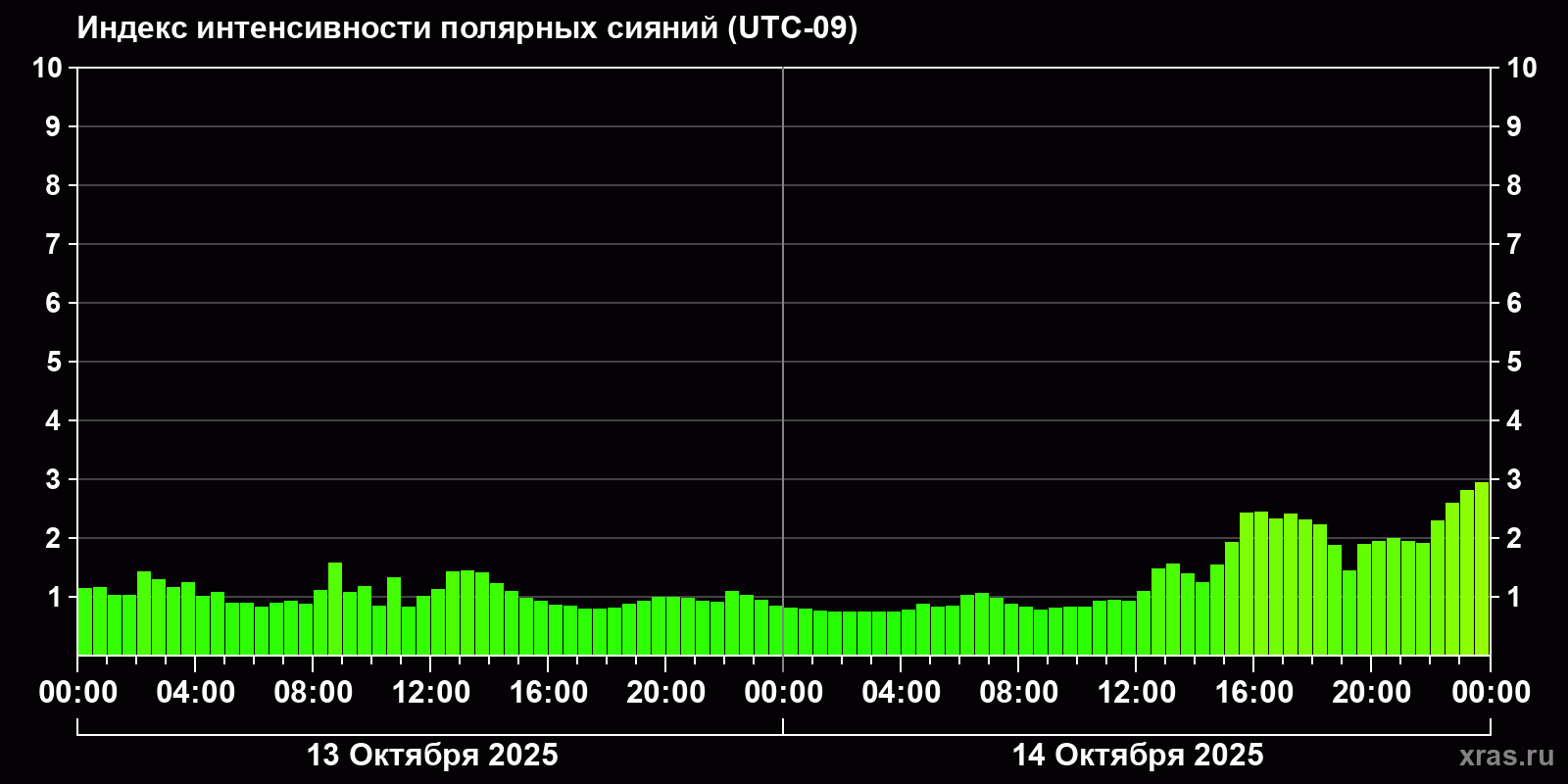 Изменения индекса интенсивности полярных сияний с 2025-10-13 по 2025-10-14 по местному времени