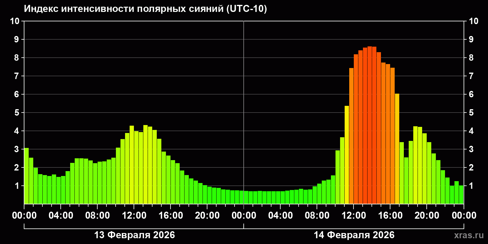 Изменения индекса интенсивности полярных сияний с 2026-02-13 по 2026-02-14 по местному времени