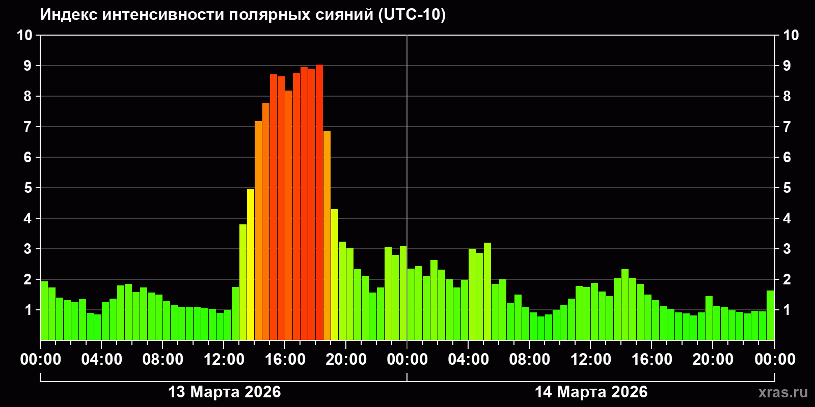 Изменения индекса интенсивности полярных сияний с 2026-03-13 по 2026-03-14 по местному времени