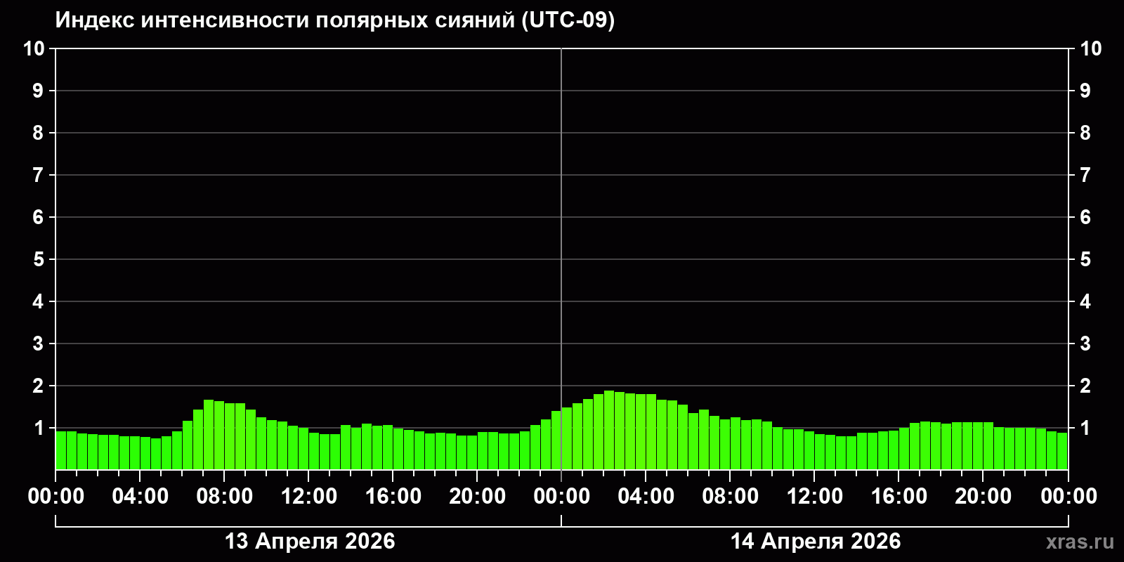 Изменения индекса интенсивности полярных сияний с 2026-04-13 по 2026-04-14 по местному времени