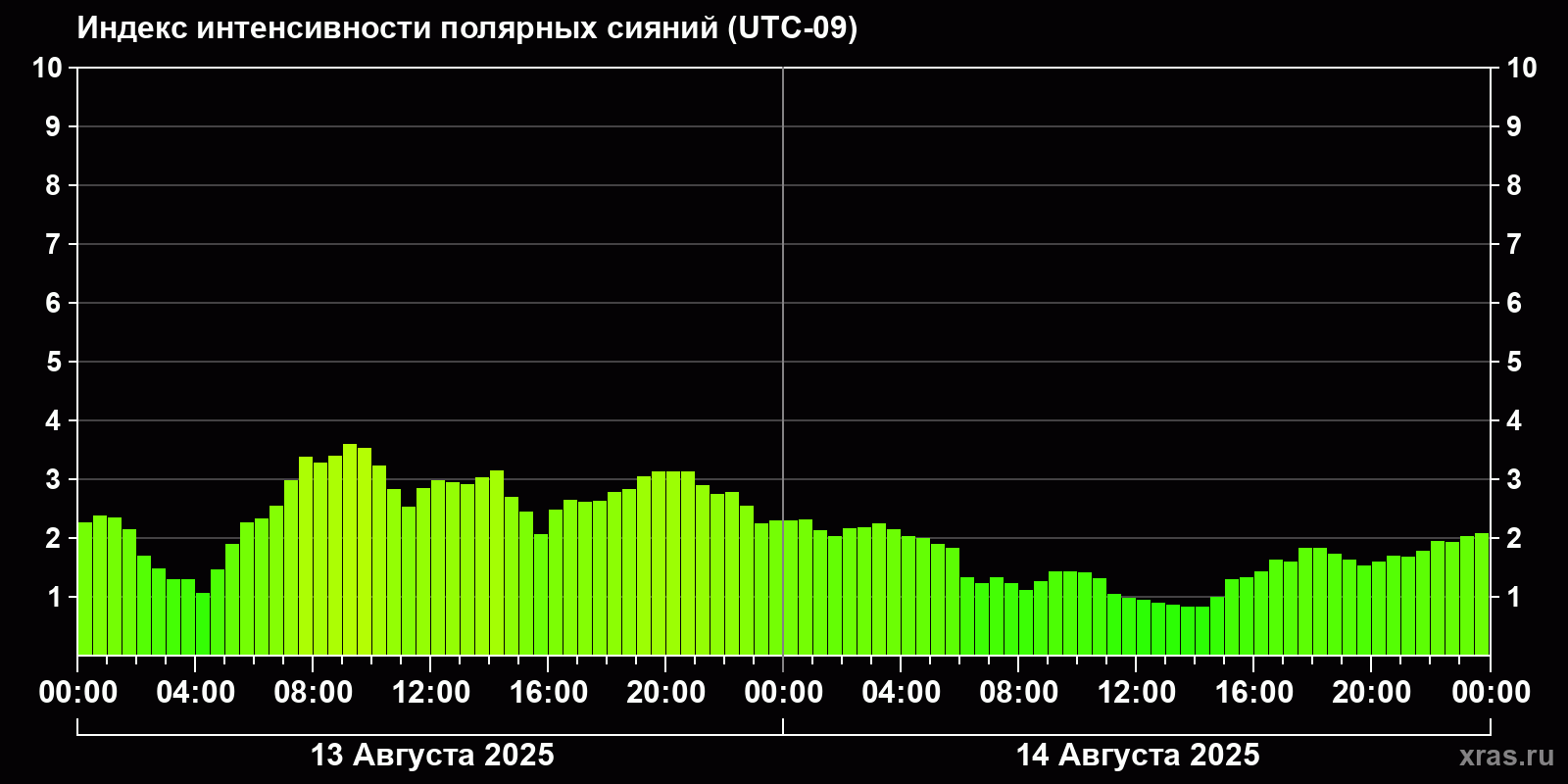 Изменения индекса интенсивности полярных сияний с 2025-08-13 по 2025-08-14 по местному времени